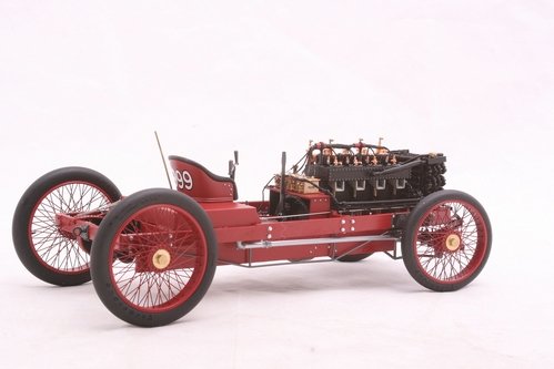 The Ford 999 was named after New York's record-breaking steam locomotive and is at the root of a Ford legend that spans over 100 years! The Ford 999 was a nameplate attached to two distinct but similar racers built by Henry Ford during the early 20th century. Though Ford's name was attached to the cars and the ensuing legend, he had ironically sold his stake in them for 0 to Barney Oldfield and collaborator Tom Cooper when the cars had refused to start during a test drive two weeks before the first race. (Ultimately, Ford would abandon his share of the racing money, but would reserve the right to promotions and publicity of the cars, which secured his image behind their eventual successes.) In summer of 1902, Cooper and Oldfield carried out further work and got the red one working. Oldfield, despite having absolutely no driving experience, learned how to race the 999. In his October 1902 debut, a five-mile race known as the Manufacturers' Challenge Cup, despite a strong challenge from Alexander Winton once again (which was the rematch for which Ford had originally planned), Oldfield easily won. The 999 set a course speed record at the track at Grosse Pointe, and went on to tour America and score many other victories. This 1/18 scale replica has been recreated faithfully by Exoto! It has been crammed full of features - here's just a few: simulated brass intake manifolds and more, accurate steering function with all metal construction, locking battery box containing six wired beer can-type batteries, simulated wood chassis features machine turned nuts and bolts, and metal brackets, foot brake acts on spring-loaded mechanism that tightens a genuine leather strap on the rear brake drum, over 650 genuine pressed brass fittings threaded onto cooling pipes in the huge radiator, hand-laced brass wire wheels with balloon-type Firestone tires, spring-loaded pedal, flywheel brake, leather-covered seat, brass fuel tank breather, and a WHOLE LOT MORE!! Read more...