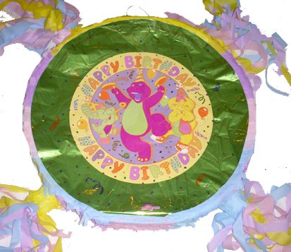Barney Custom Pinata Your Barney Birthday party is not complete without a Barney pinata. The pinata is 15 x 15 x 3.5". Fill it with candy and party favors for a fun party game. The item is new. This pinata is custom made to order mylar party pinata. This listing is for the pinata only, filling is not included. Custom pinatas are made to order, streamer arrangement and coloring may vary. Read more...