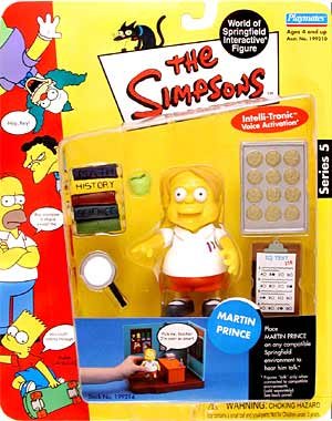 MARTIN PRINCE The Simpsons Series 5 World Of Springfield Interactive Action Figure. Welcome to Springfield, USA - the town that put the "fun" in dysfunctional! Whether enjoying the shotgun sociability of Moe's Tavern, a creamed cornsicle at the Springfield Retirement Castle, the gene-altering radiance of the Springfield Nuclear Power Plant, or the warm perspiration of a Kwik-E-Mart heat-lamp dog, you'll always feel special in Springfield - the town America call "shabby"! So please visit us here in Springfield, where - compared to us - you're royalty. Figures stand approximatetly 5 inches tall. Features Intelli-tronic Voice Activation -Just move them around any compatible World of Springfield Interactive Environment (sold seperately) to hear them talk. Ages 4 and up. From Playmates Read more...